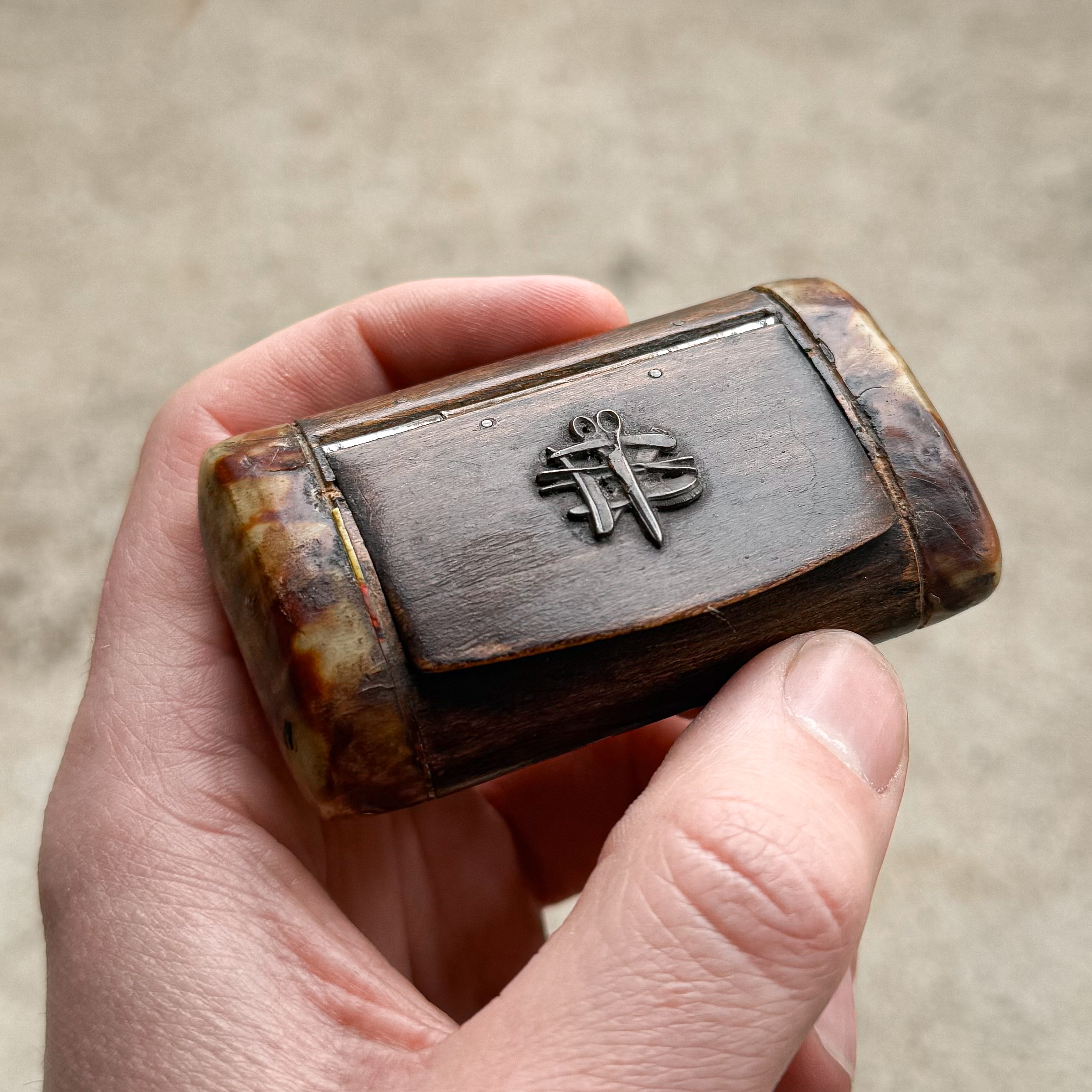 This elegant antique snuff box is a unique example of French folk art from the 19th century. The lid features a metal emblem depicting scissors, a curling iron, a brush, and a straight razor, suggesting that it was originally owned by a barber.