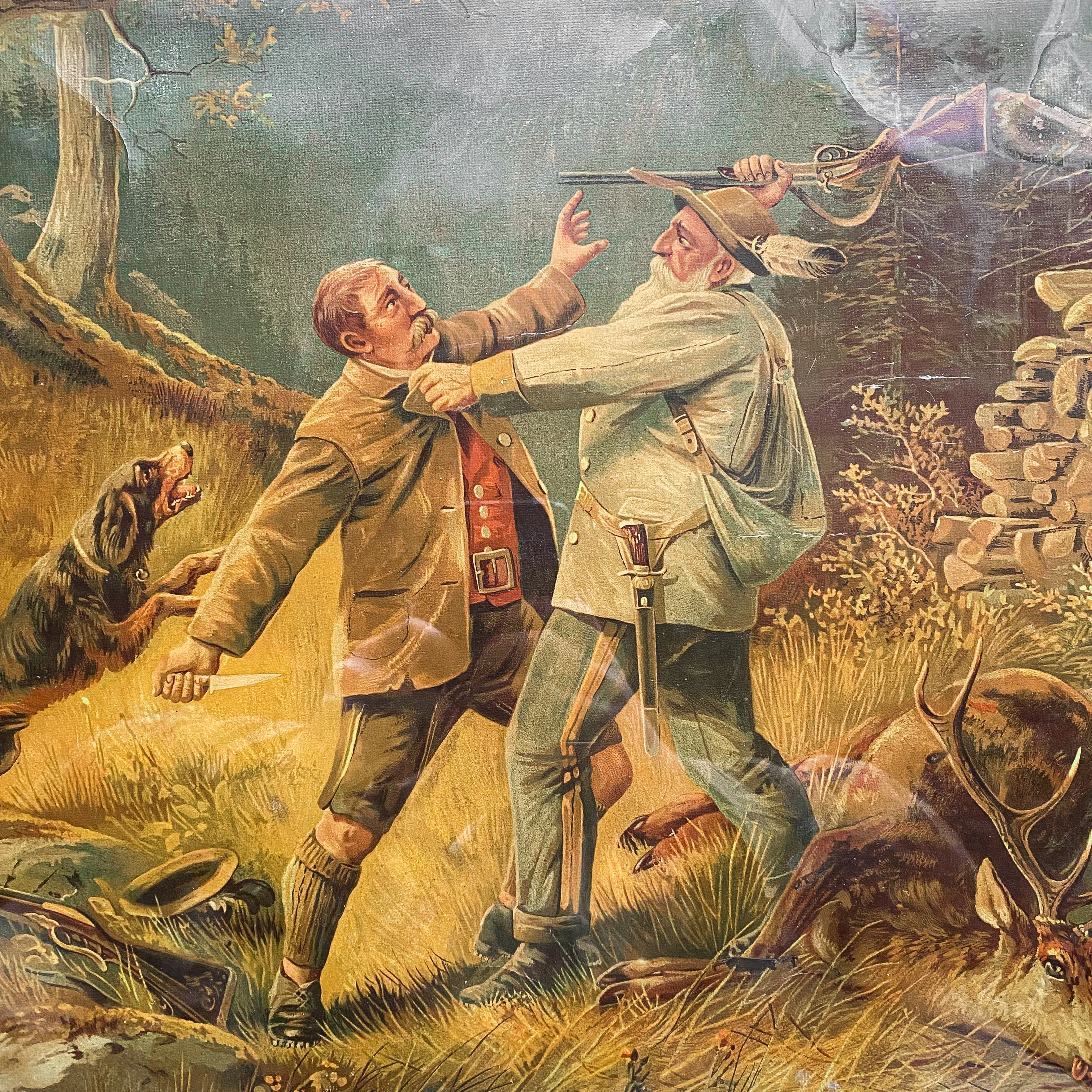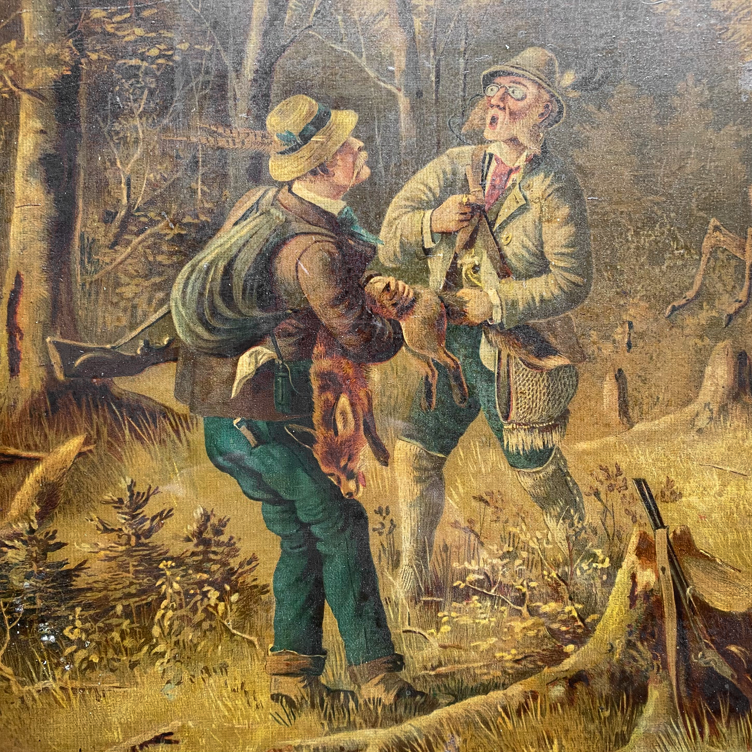 This unique print depicts an idyllic, humorous scene of hunters and their dogs set in a beautiful German landscape.