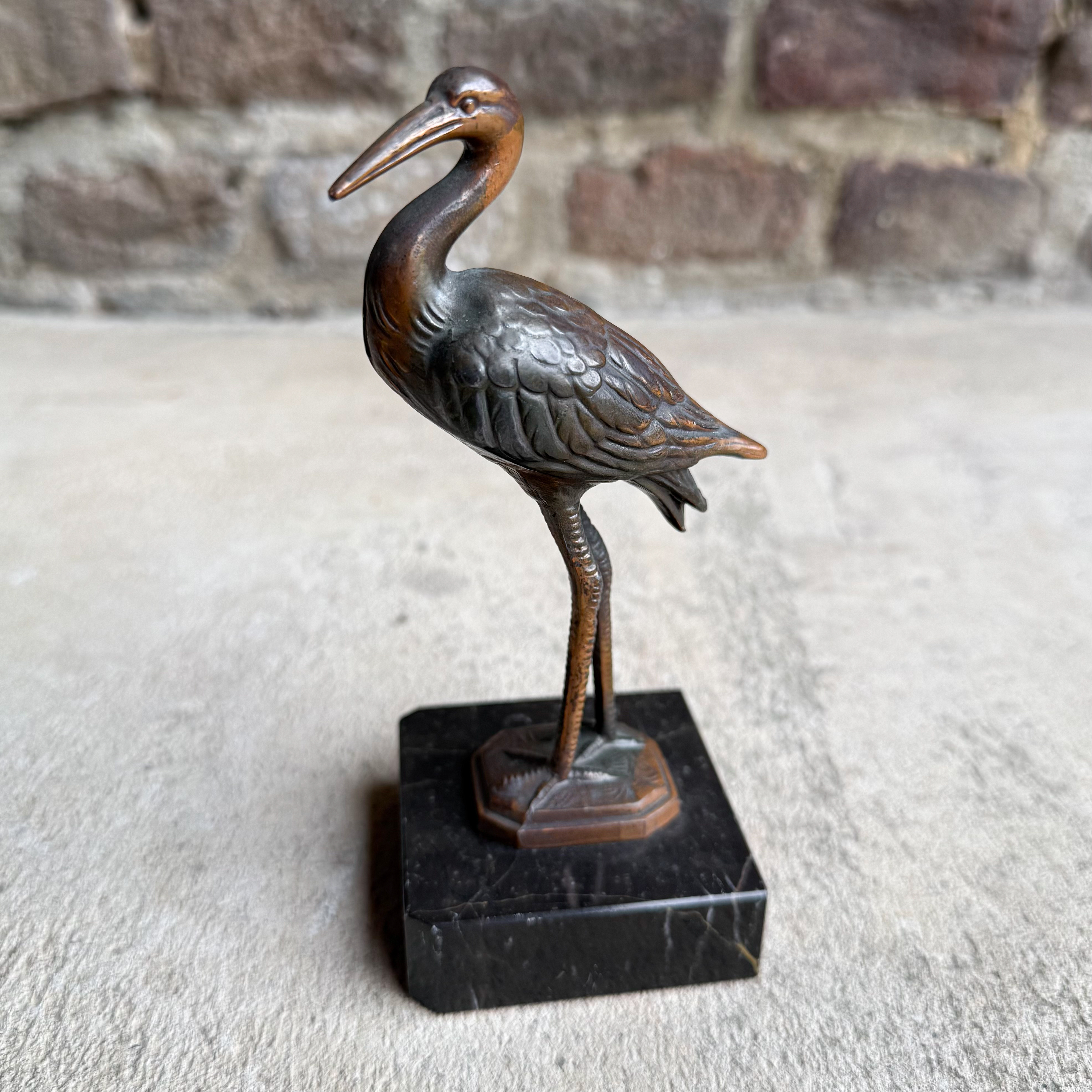 This distinctive bronze sculpture features an elegant Art Deco stork, mounted on a black marble base and signed by a French artist. The streamlined form and poised posture are characteristic of the refined aesthetics of the 1930s.