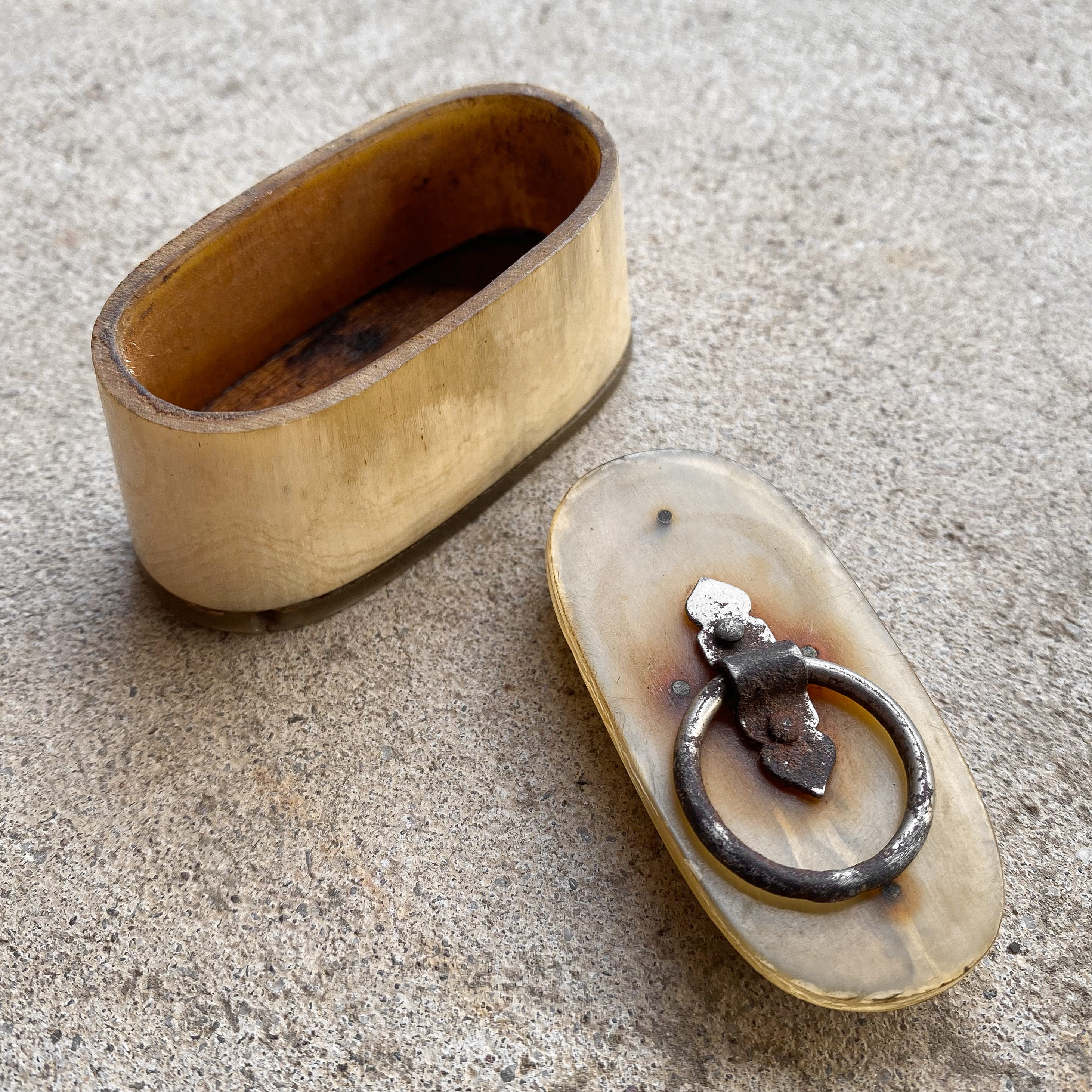 Despite its age, the snuff box remains in good condition. Over the years, it has developed a beautiful natural patina that enhances its character. The metal fittings and top ring show some light oxidation, which only adds to its antique appeal.