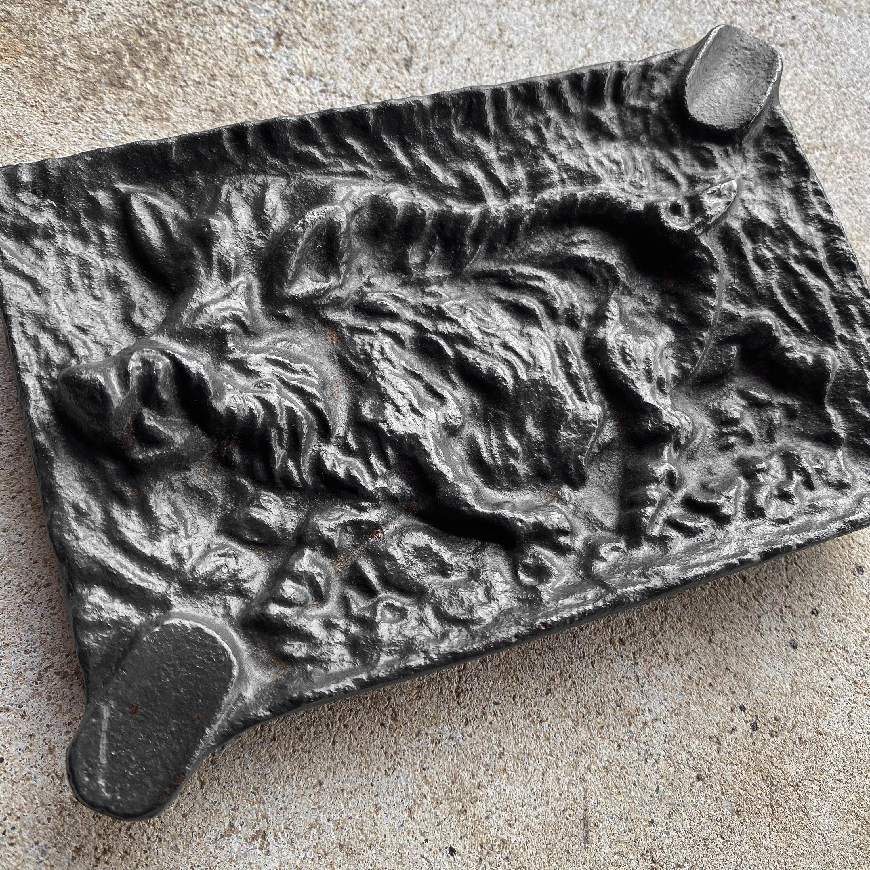 This antique cast iron ashtray from the 1930s features a beautifully detailed relief of a wild boar.