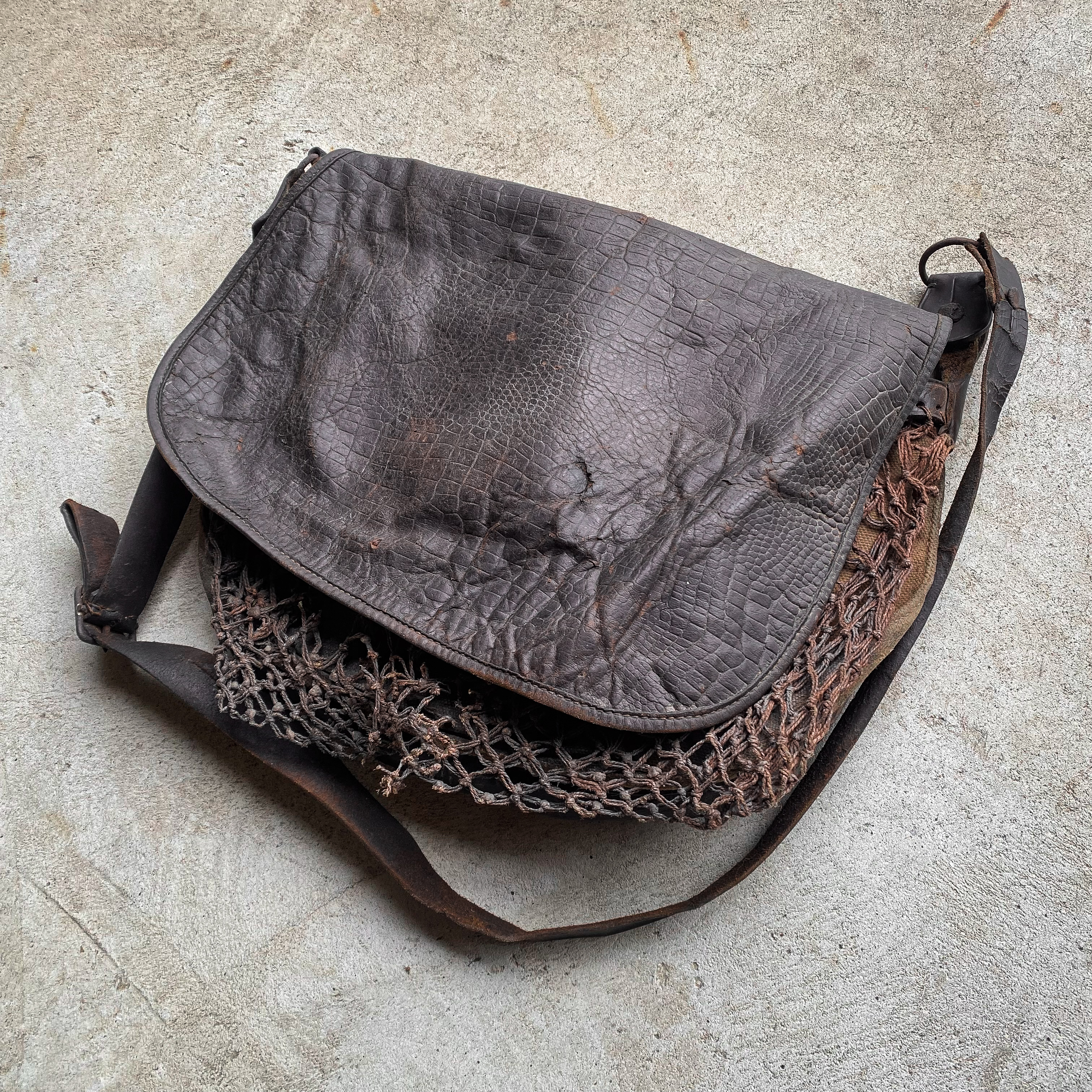 After nearly a century, the bag is in used condition and shows signs of wear. Over the years, it has developed a beautiful patina that adds to its charm, though the leather has become fragile with age. The net originally used for carrying game is torn in several places.