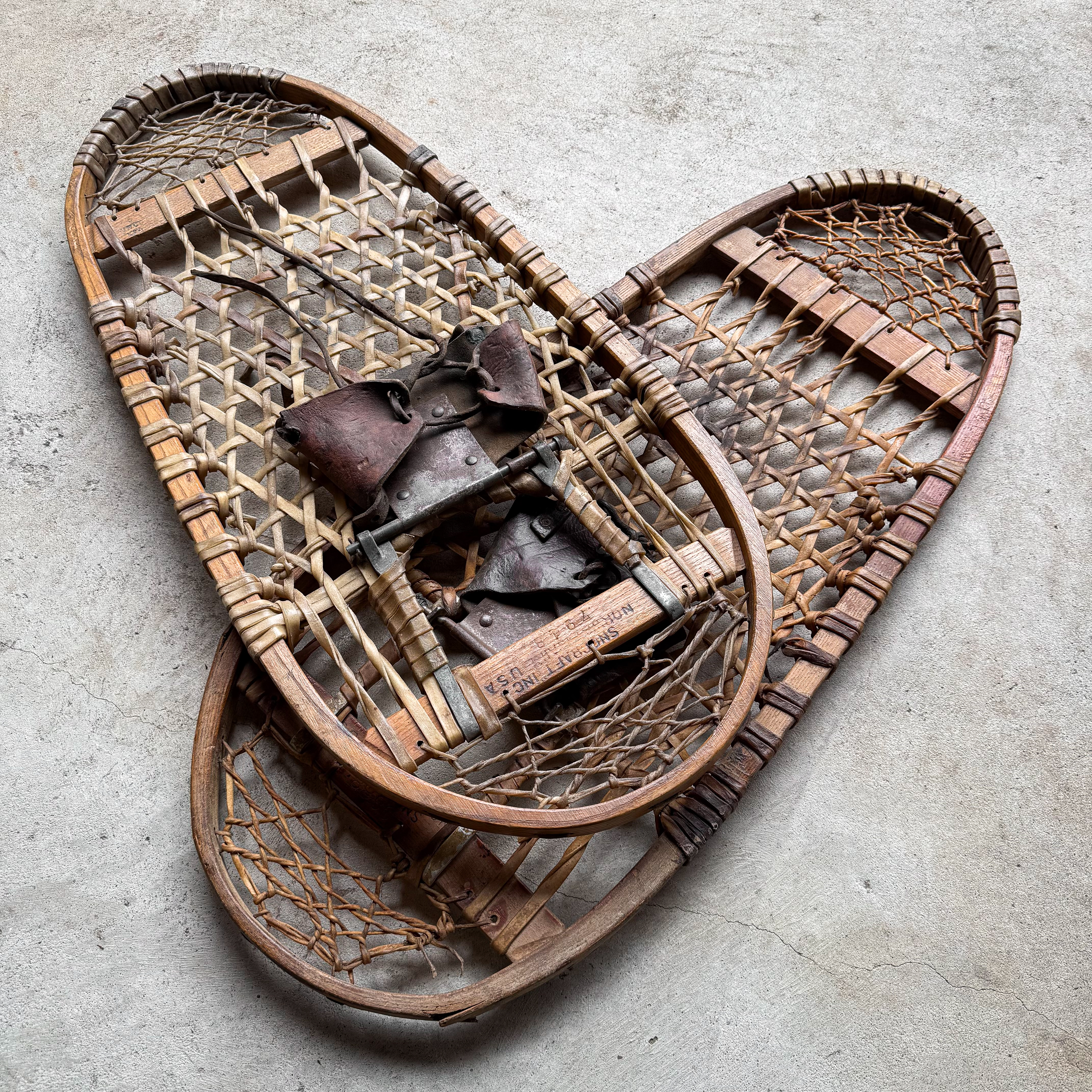 After more than 70 years, they remain in worn condition, showing clear signs of age and use. One of the snowshoes has a small crack in the upper right corner. They have been carefully cleaned and treated with antique wax, providing a protective layer and a subtle, soft sheen. All leather components have been conditioned with grease to help preserve their suppleness and durability.