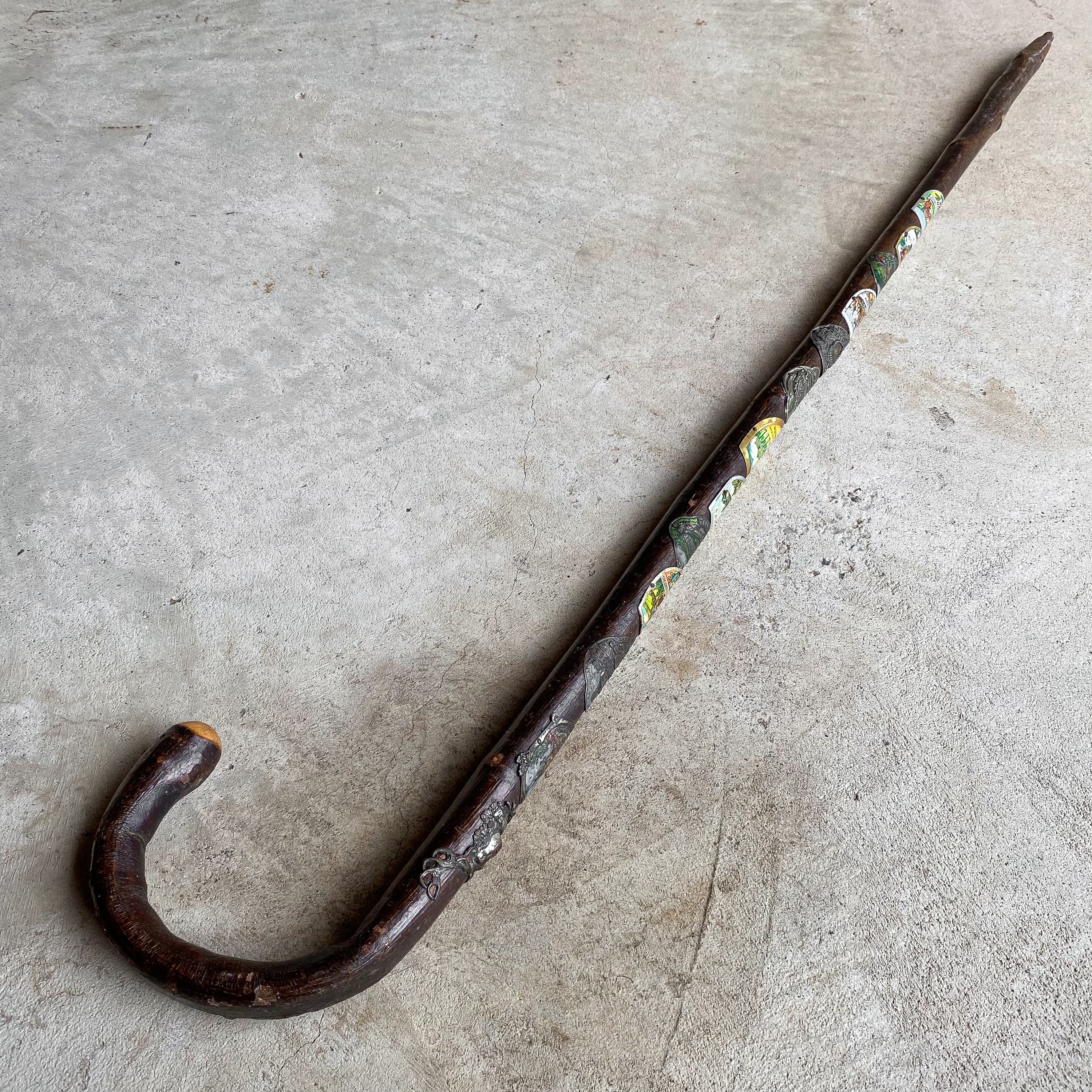 • Antique Vintage 30s 1930s German Mountain Wooden Cane Walking Stick Badges Souvenir Collection Cabin Lodge Decor