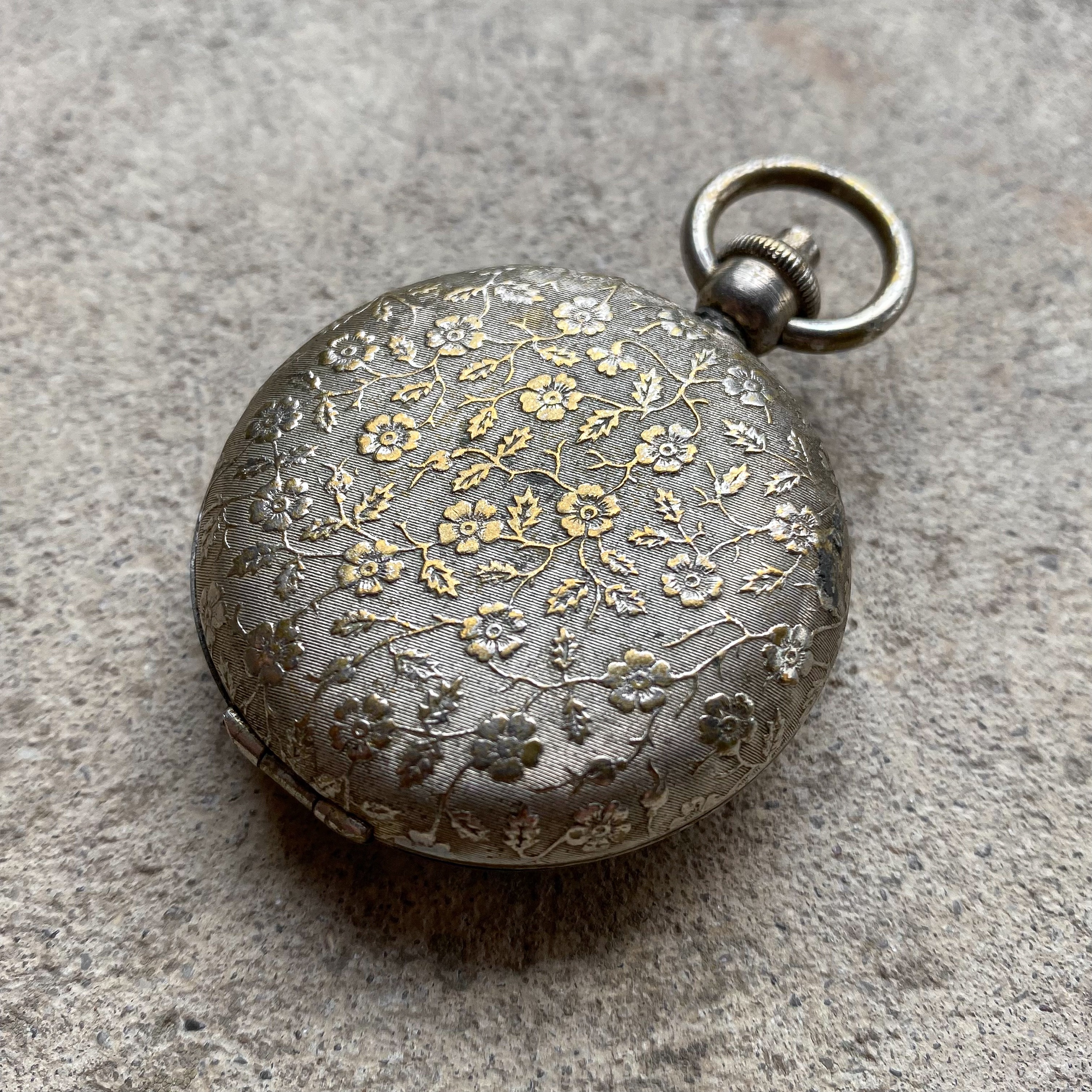 It features a metal case with a folding cover that is decorated with flowers and a shield.