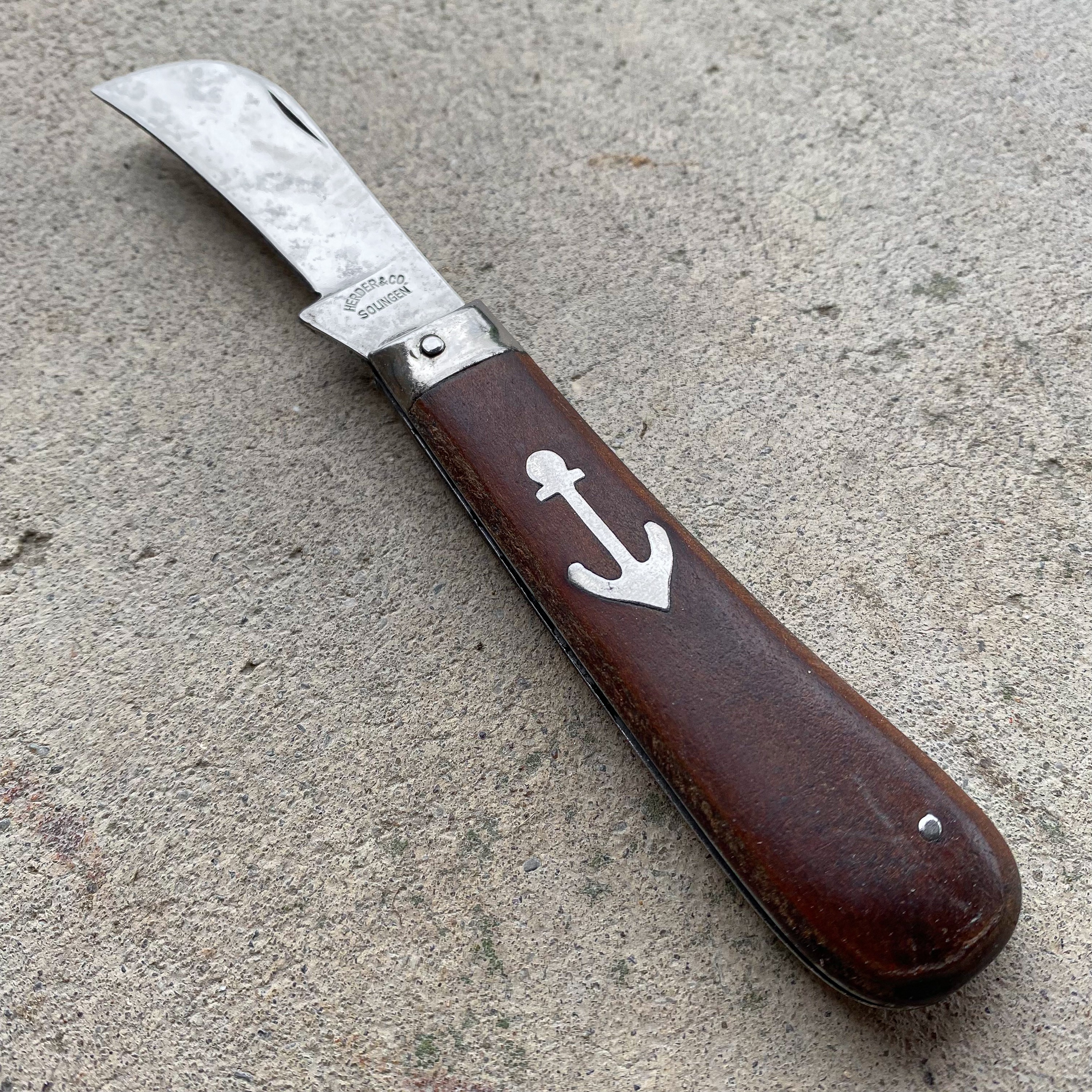 The knife fearures a folding blade and oak handle with a characteristic anchor worked into it.