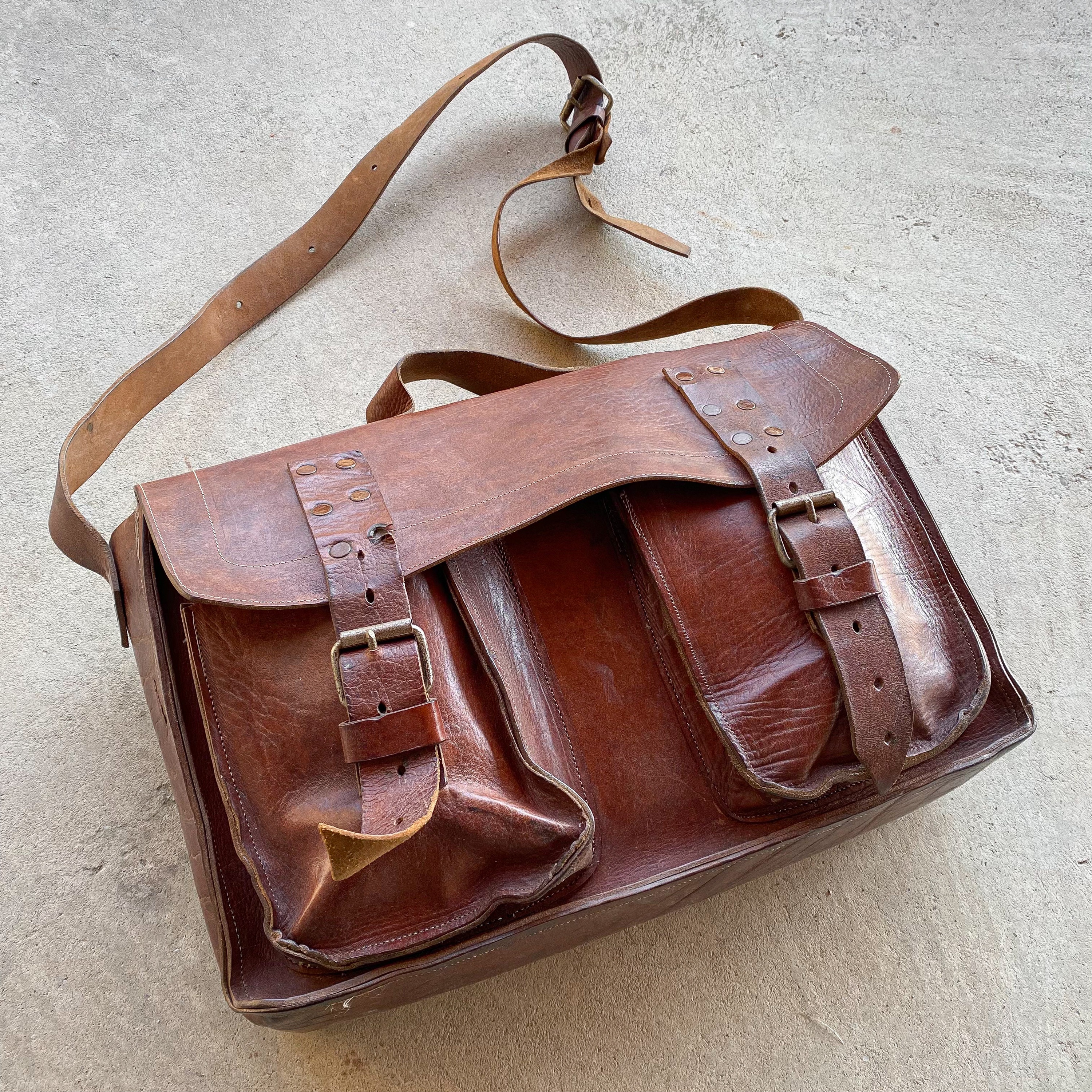 It’s made of sturdy brown leather and features two small pockets in front and a large compartment, big enough to store a laptop, books or multiple documents!