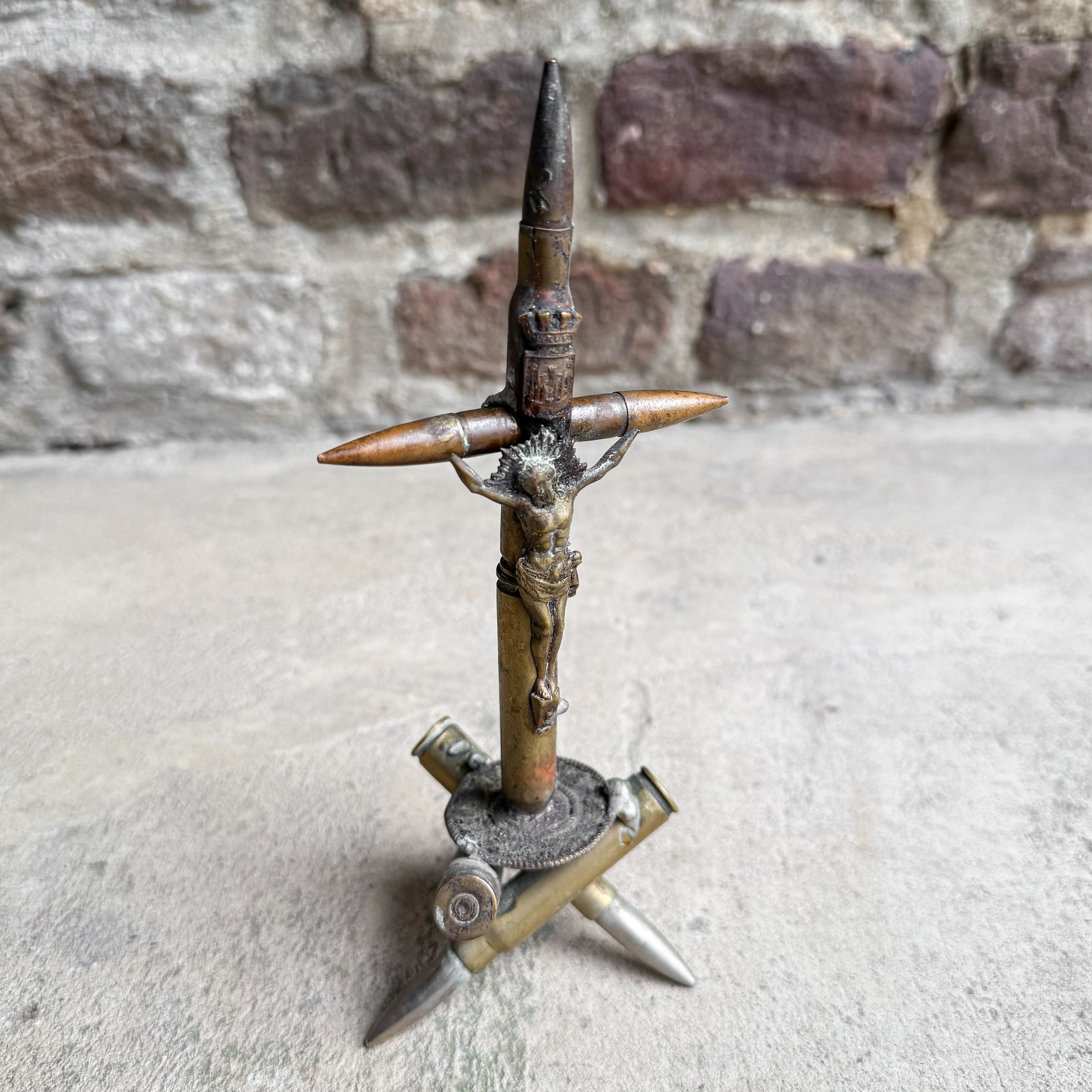 This remarkable crucifix dates from the First World War and was crafted from spent bullets and shell casings. It stands as a poignant reminder of the conflict and reflects the personal expressions that emerged from the hardships of war.