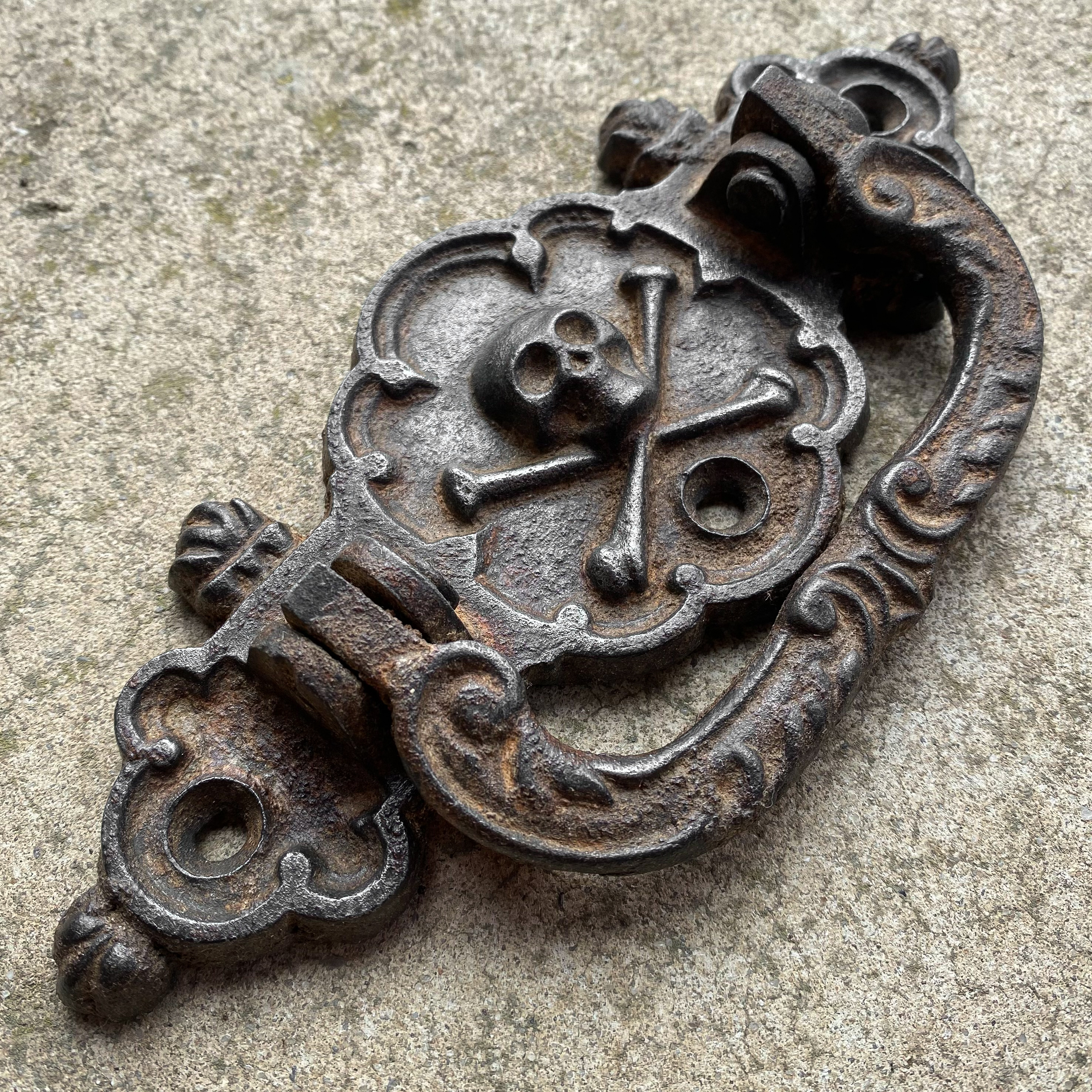 This antique iron handle was once mounted on a coffin and was unearthed during the excavation of old burial sites. Adorned with a skull and crossbones, it features a striking gothic design, making it a truly distinctive piece.