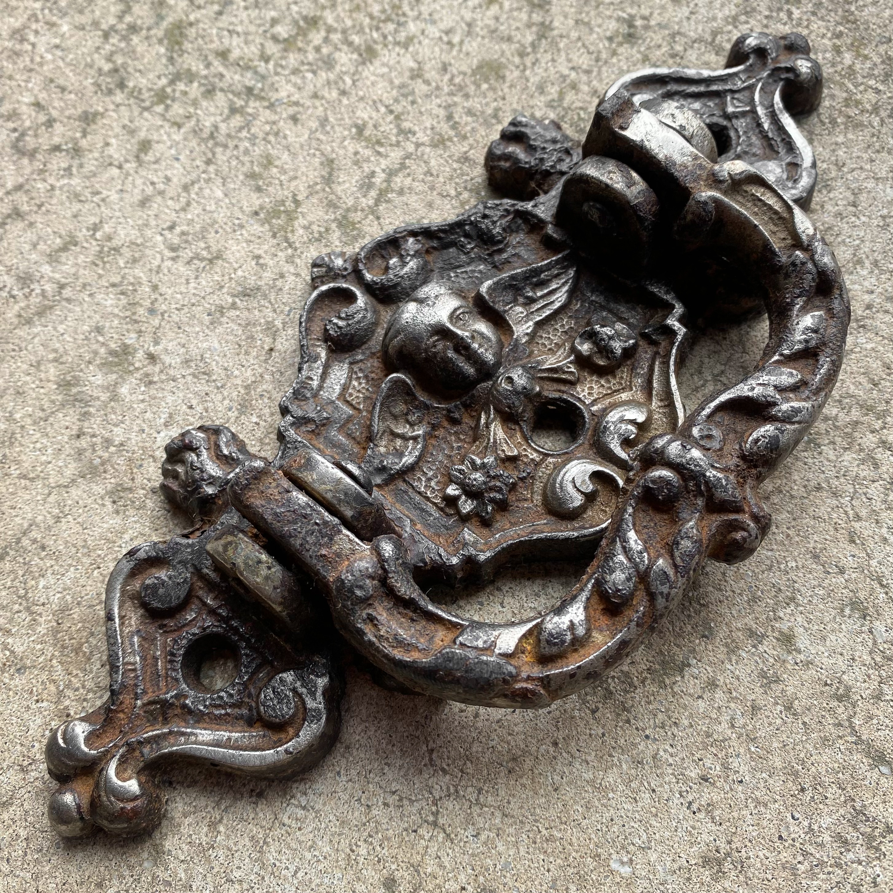 This antique iron handle was once mounted on a coffin and was unearthed during the excavation of old burial sites. Adorned with an angel, it features a striking gothic design, making it a truly distinctive piece.