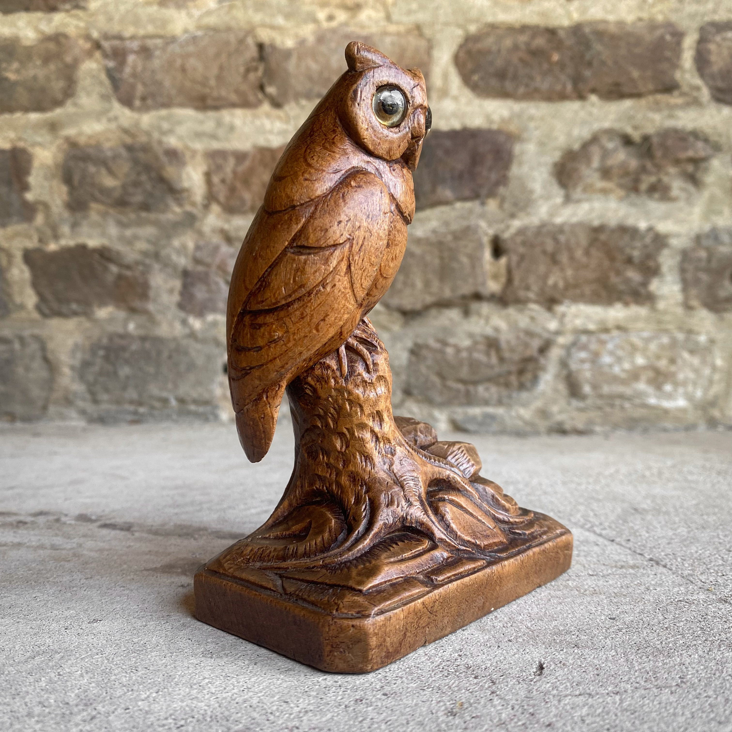 This charming owl figure was traditionally hand-carved from a single piece of walnut wood in the Black Forest region, known for its rich heritage in woodcraft. It stands as a fine example of the exceptional craftsmanship that made the area world-renowned, featuring intricate detailing and striking glass eyes that bring it to life.