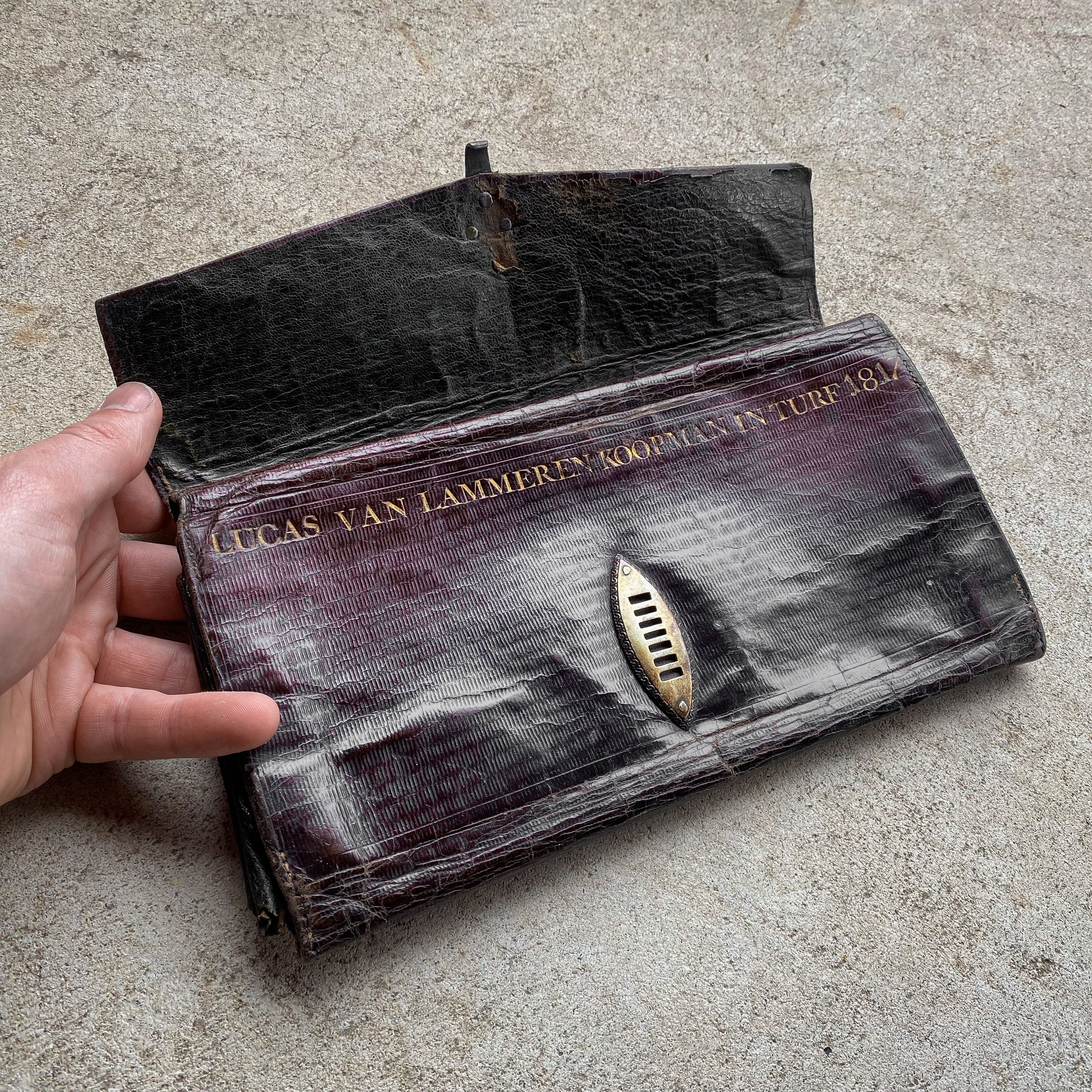 This remarkable antique pocketbook dates back to the early 19th century and bears the inscription ‘Lucas Van Lammeren Koopman in Turf 1817’ in elegant gilded letters — which translates to ‘Lucas Van Lammeren, Salesman in Peat’.