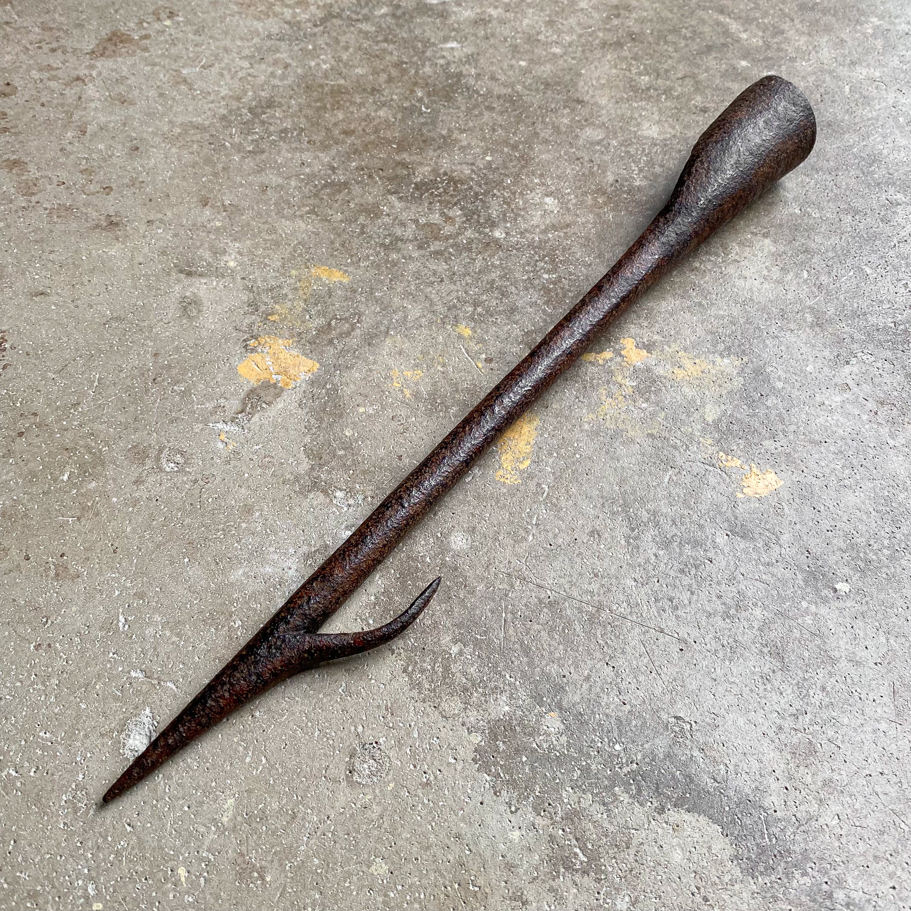 It was hand-wrought and forged in iron with a cone to attach a wooden handle.
