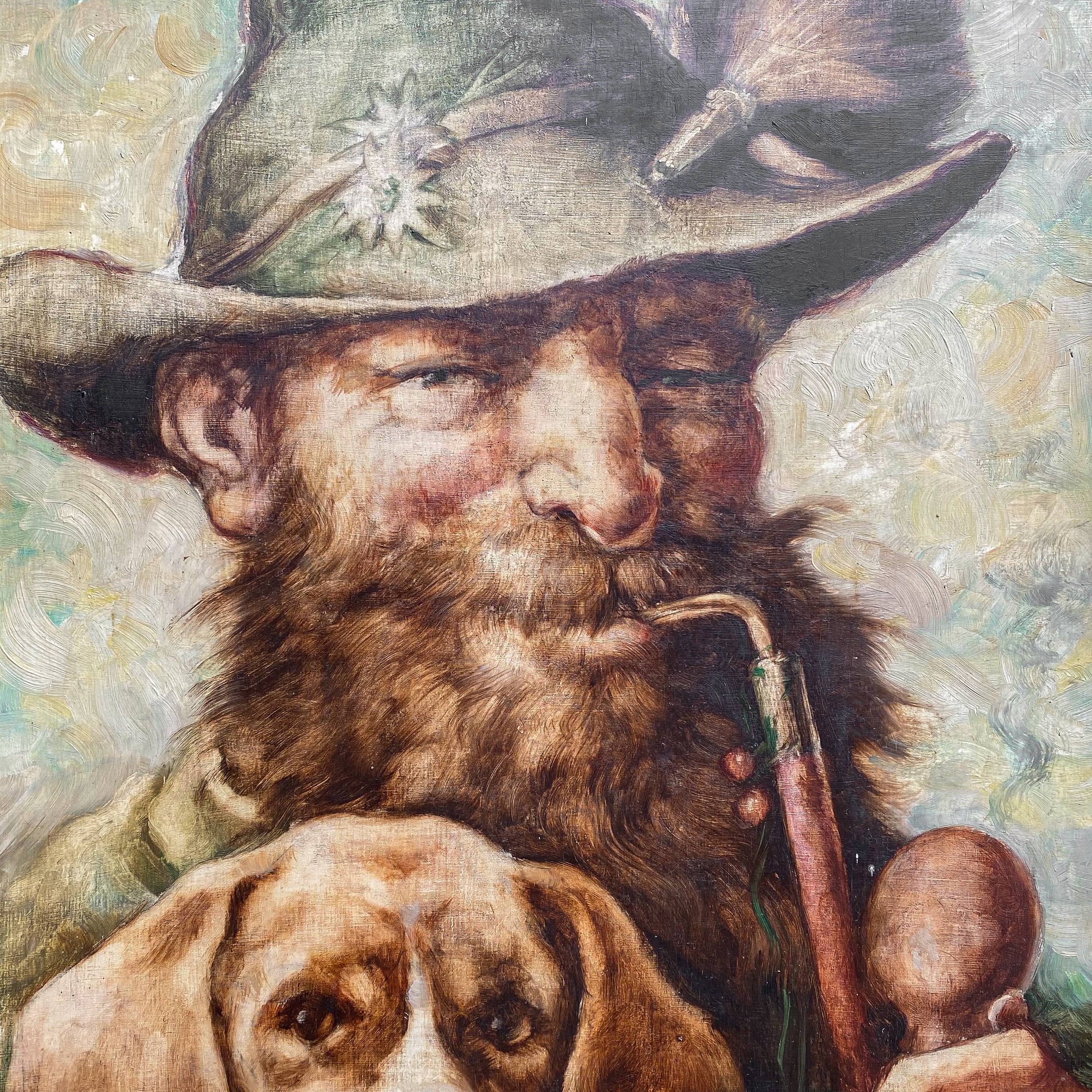 Antique 40’s oil portrait of hunter man and his dog