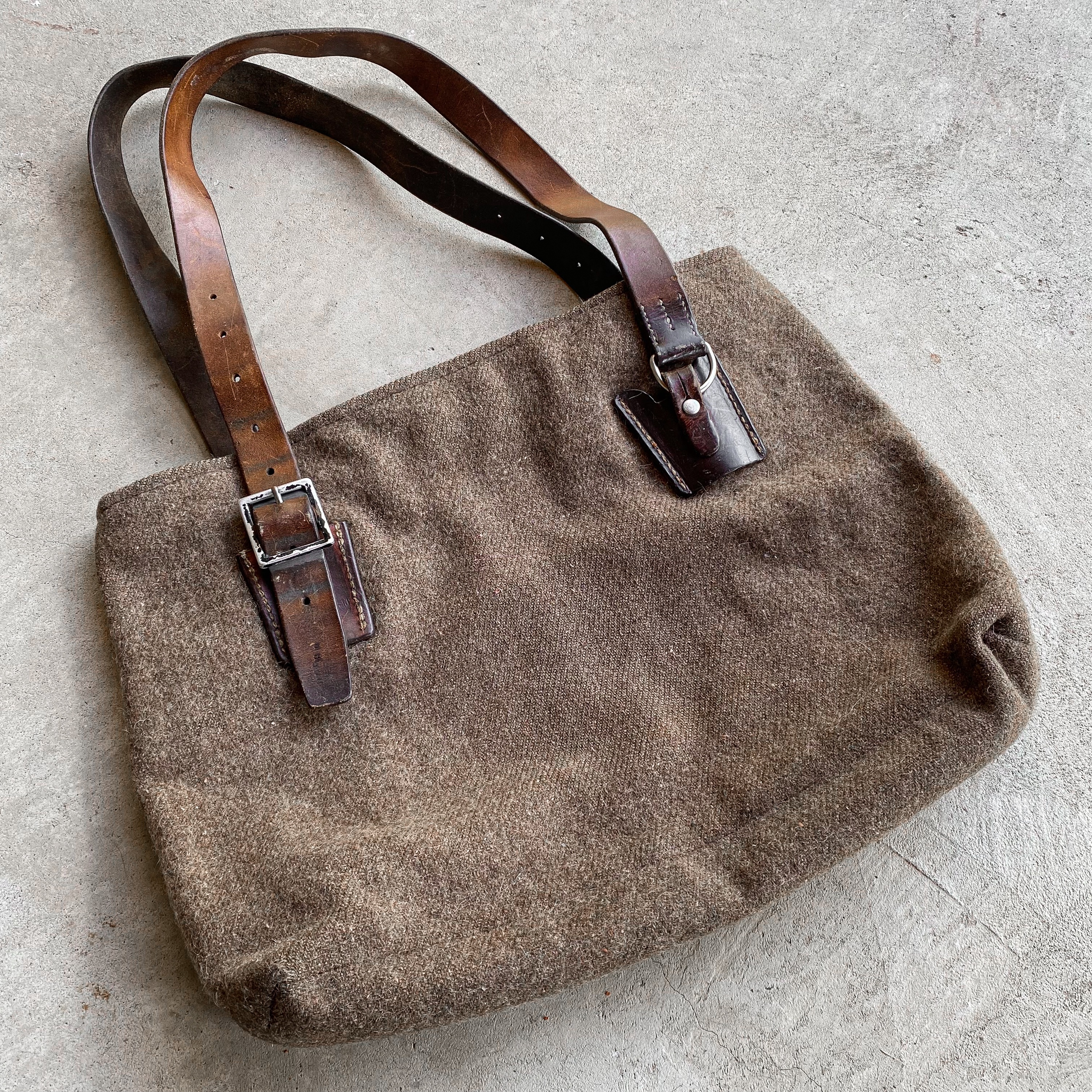 This unique bag is made out of old Swiss army gear. The bag itself is made out of a wool military issued blanket, the leather shoulder straps are reused from other bags and are attached with to leather bayonet sheath pieces.
