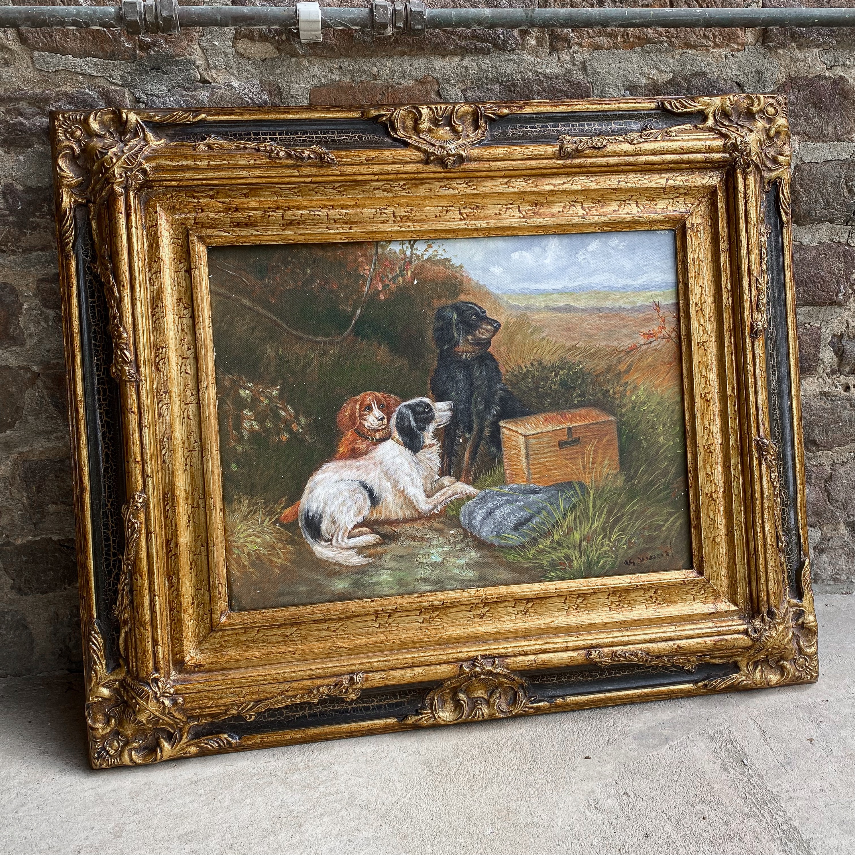 This classic scene was painted on canvas and shows three dogs in a beautifull landscape scene.
