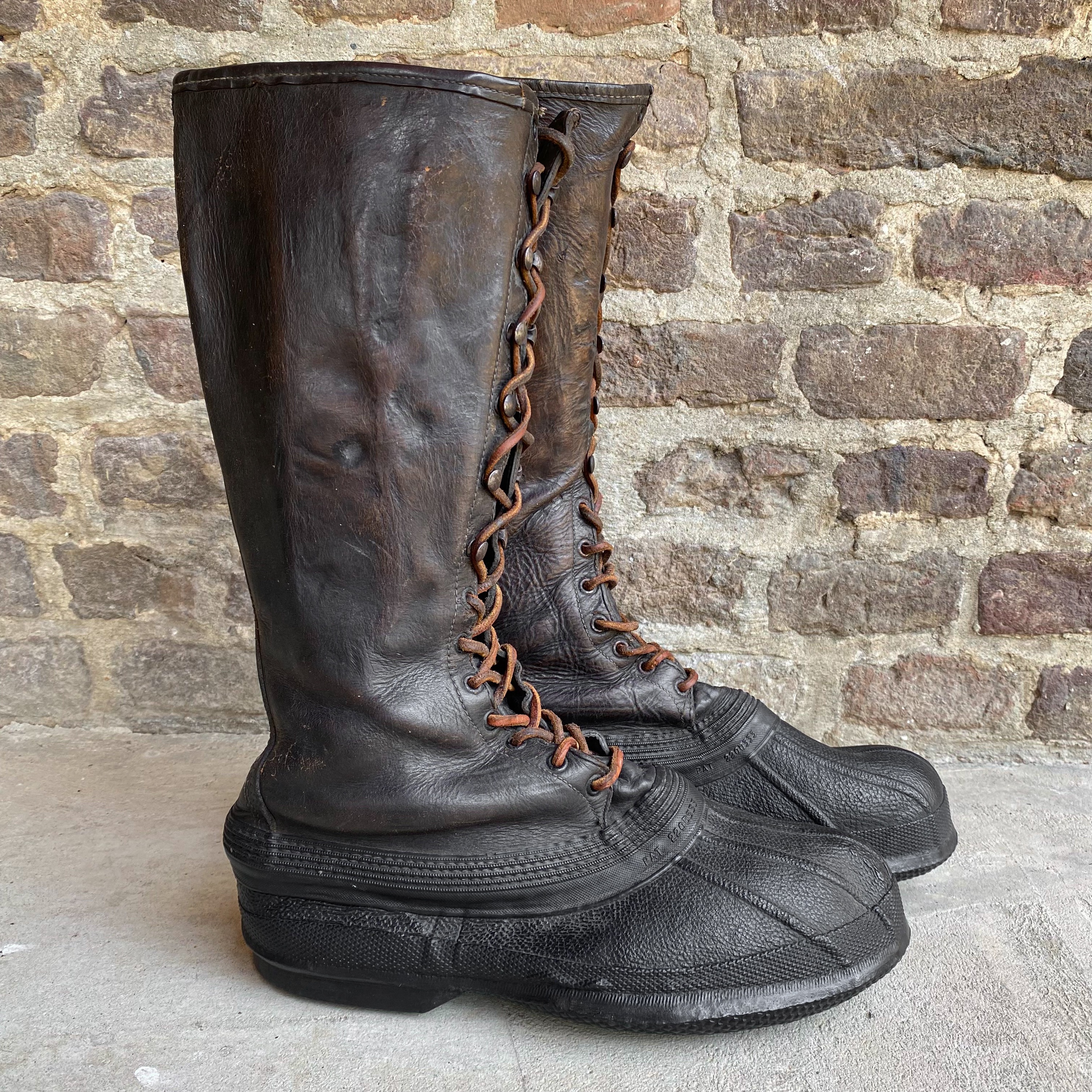 After 80 years the boots remain in worn condition. Due to time they acquired a distressed patina. The right boot is missing a lace hook and also shows a small rip in the leather in the side.