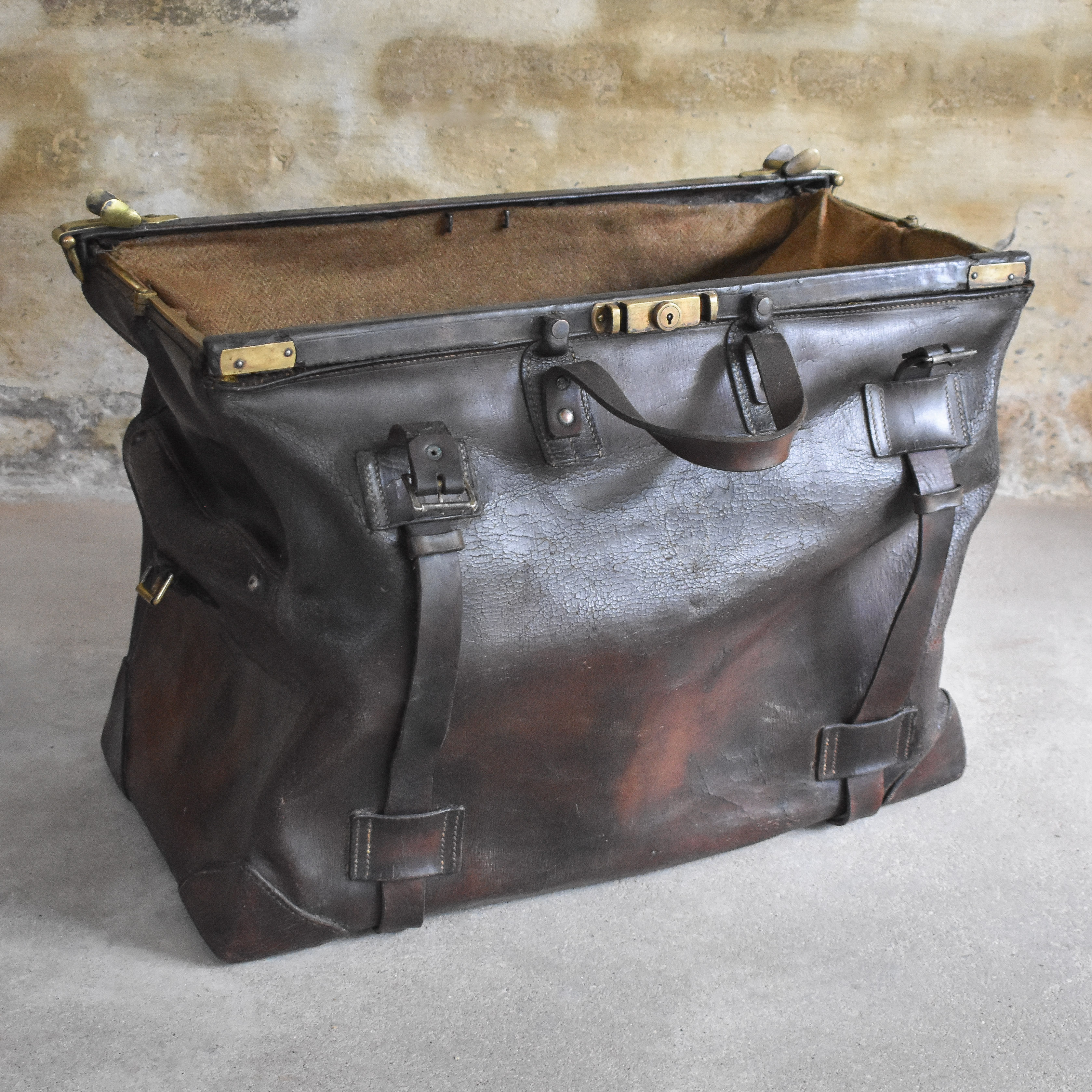 After almost a century it is in a worn condition but still remains strong! The patina it acquired over the years only adds to its rugged character! It has been cleaned with saddle soap and treated with grease and beeswax.