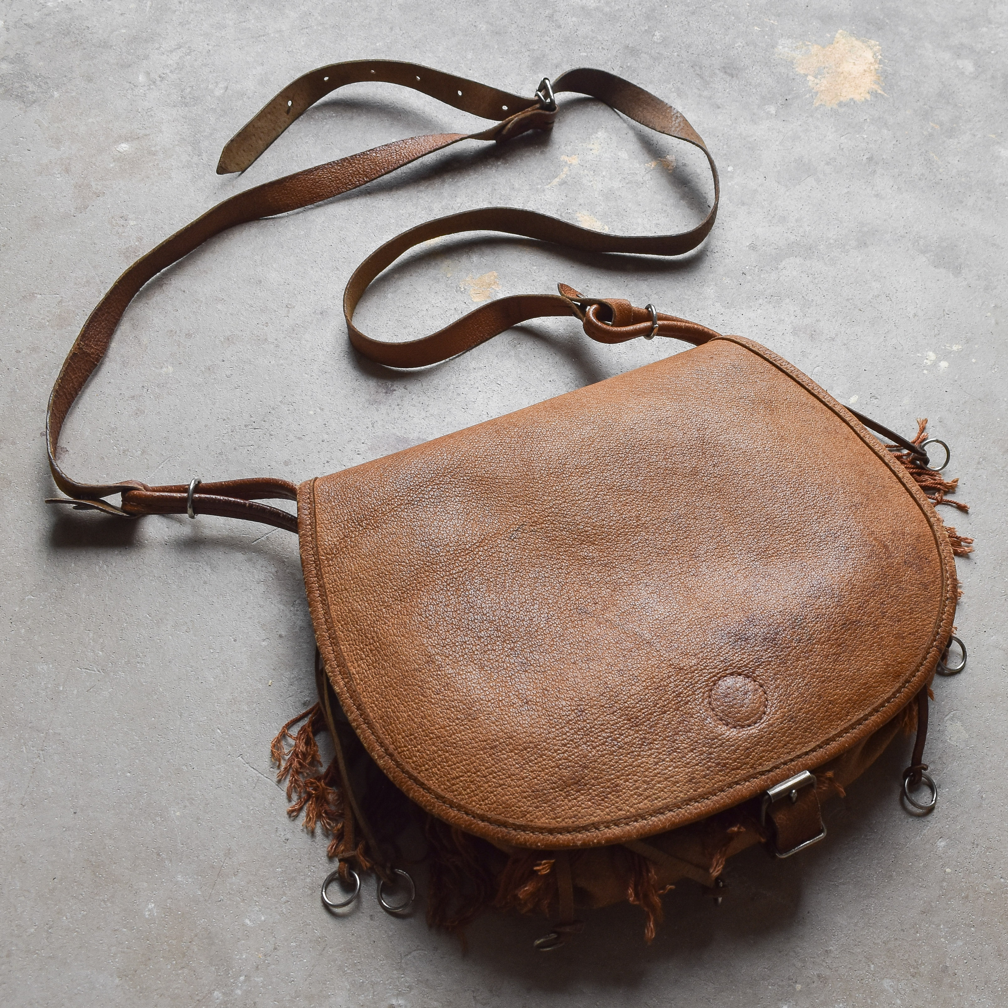 It features multiple departments, a net and small straps that can be used for carrying rabbits or birds. It is made of brown leather and feautures an adjustable leather shoulder strap.