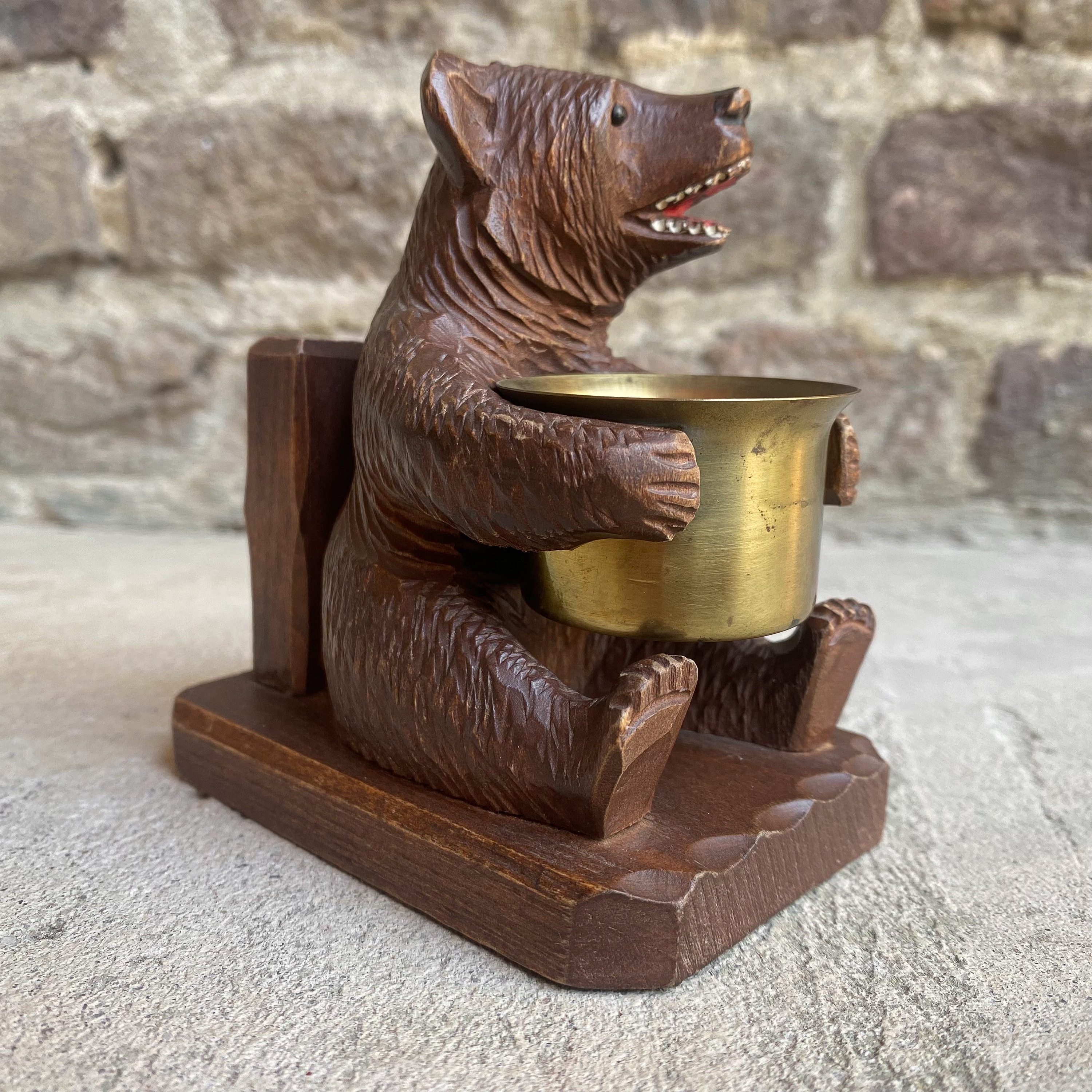 This unique piece of folk art was traditionally hand carved out of hard wood in the Black forest area in Germany or Switserland. It’s a fine example of the great craftsmanship the area got famous for and shows beautiful details. The wooden bear figure is holding a brass bowl that can be used as an ashtray