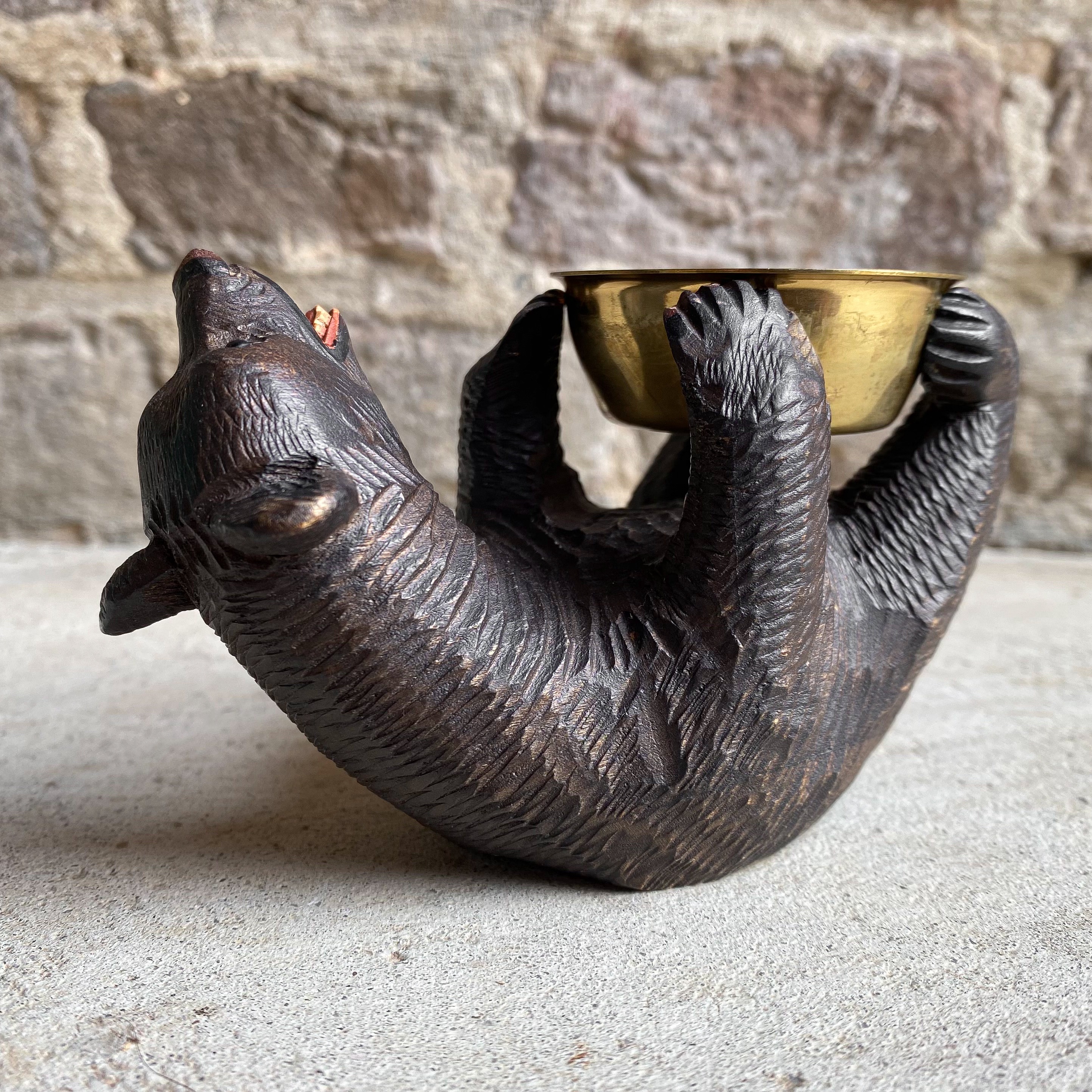 This unique piece of folk art was traditionally hand carved out of hard wood in the Black forest area in Germany or Switserland. It’s a fine example of the great craftsmanship the area got famous for and shows beautiful details. In the middle of the bears bag is a brass bowl that can be used as an ashtray.