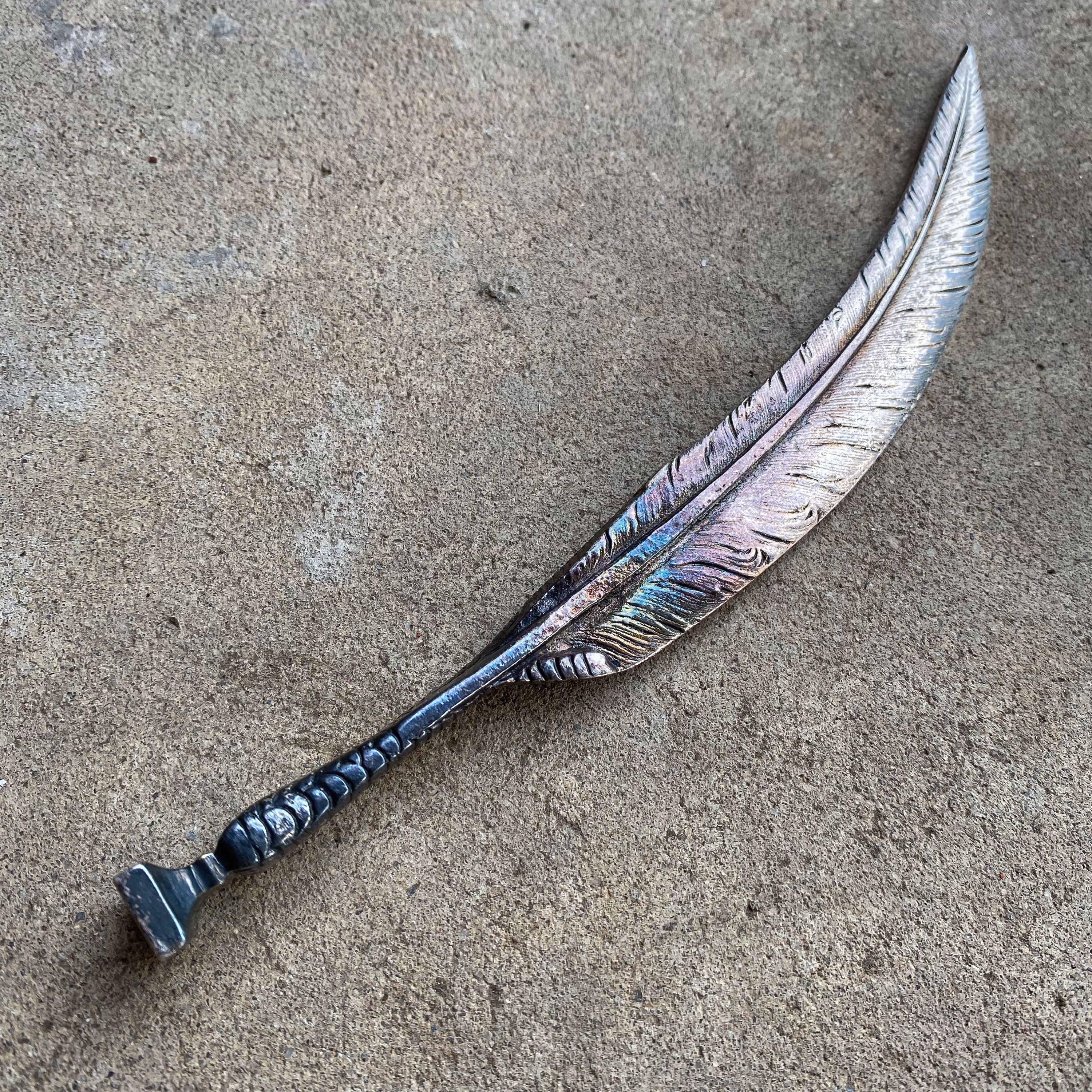It features a Art Nouveau style design and is shaped like a birds claw holding a feather
