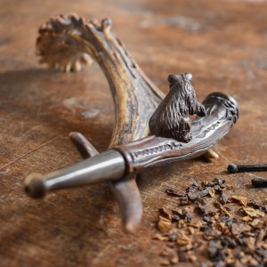 This antique pipe was traditionally hand carved out of one single piece of oak wood. It’s a fine example of great craftmanship that shows beatiful details and features a horn nozzle and characteristic bear figure on top.