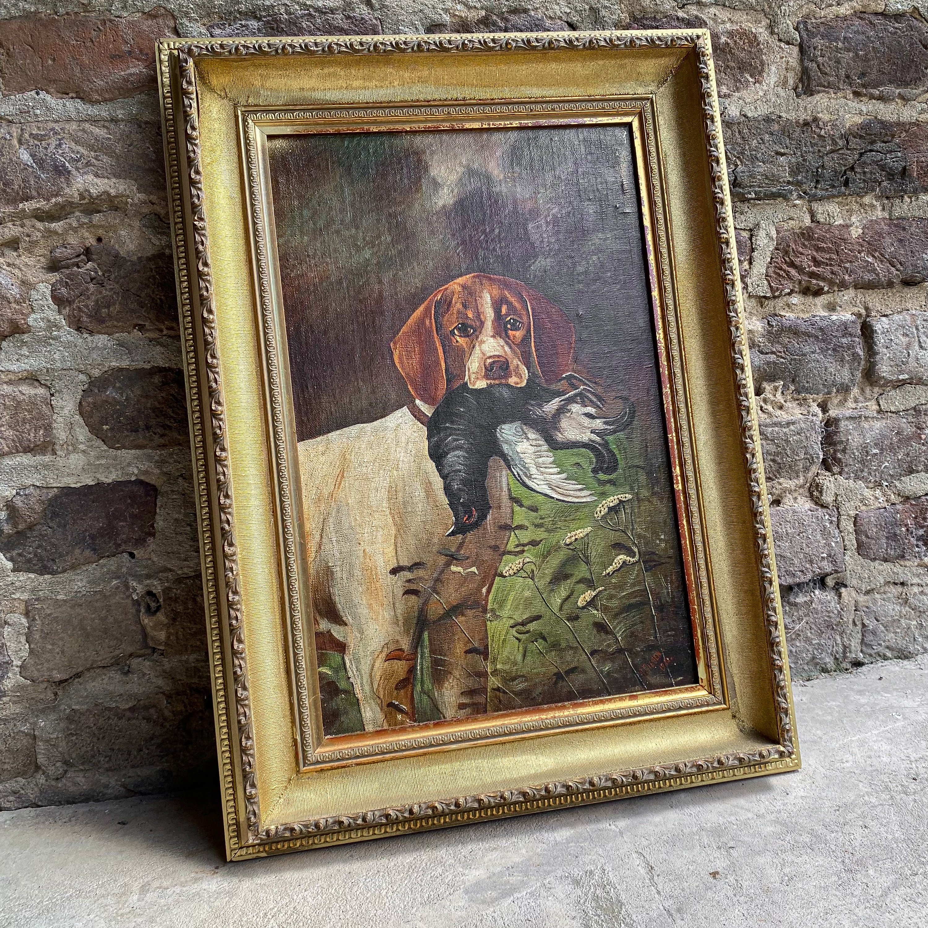 This classic scene was painted on hardboard and shows a pointer dog retreving a grouse in its mouth.